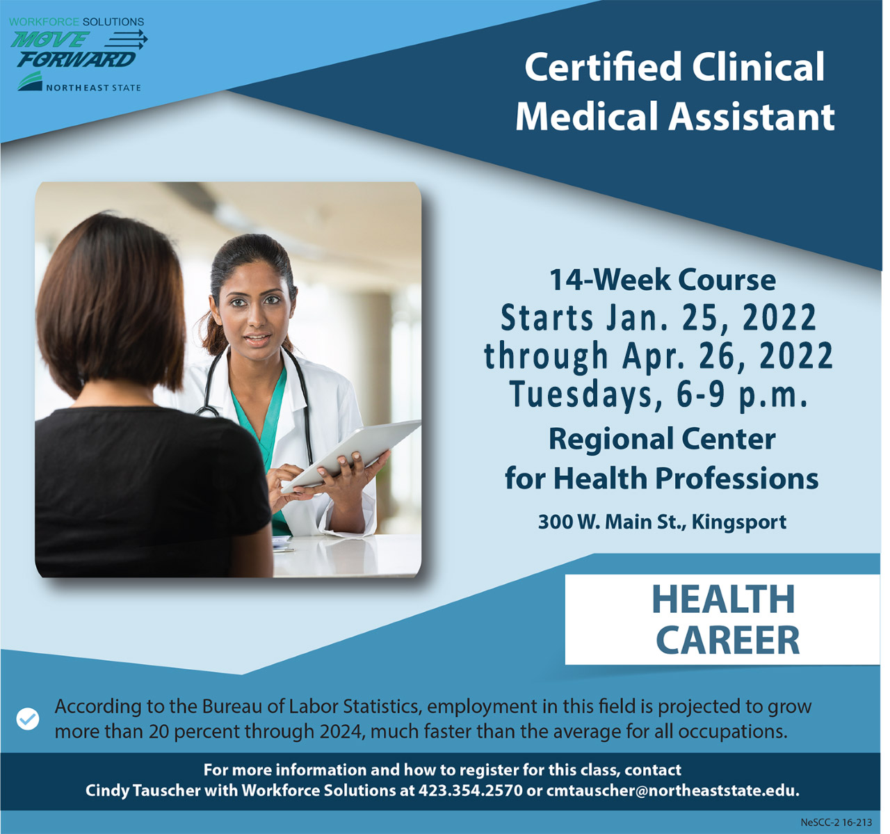 Northeast State’s Workforce Solutions presents a 14-week Certified Clinical Medical Assistant (CCMA) course beginning January 25.