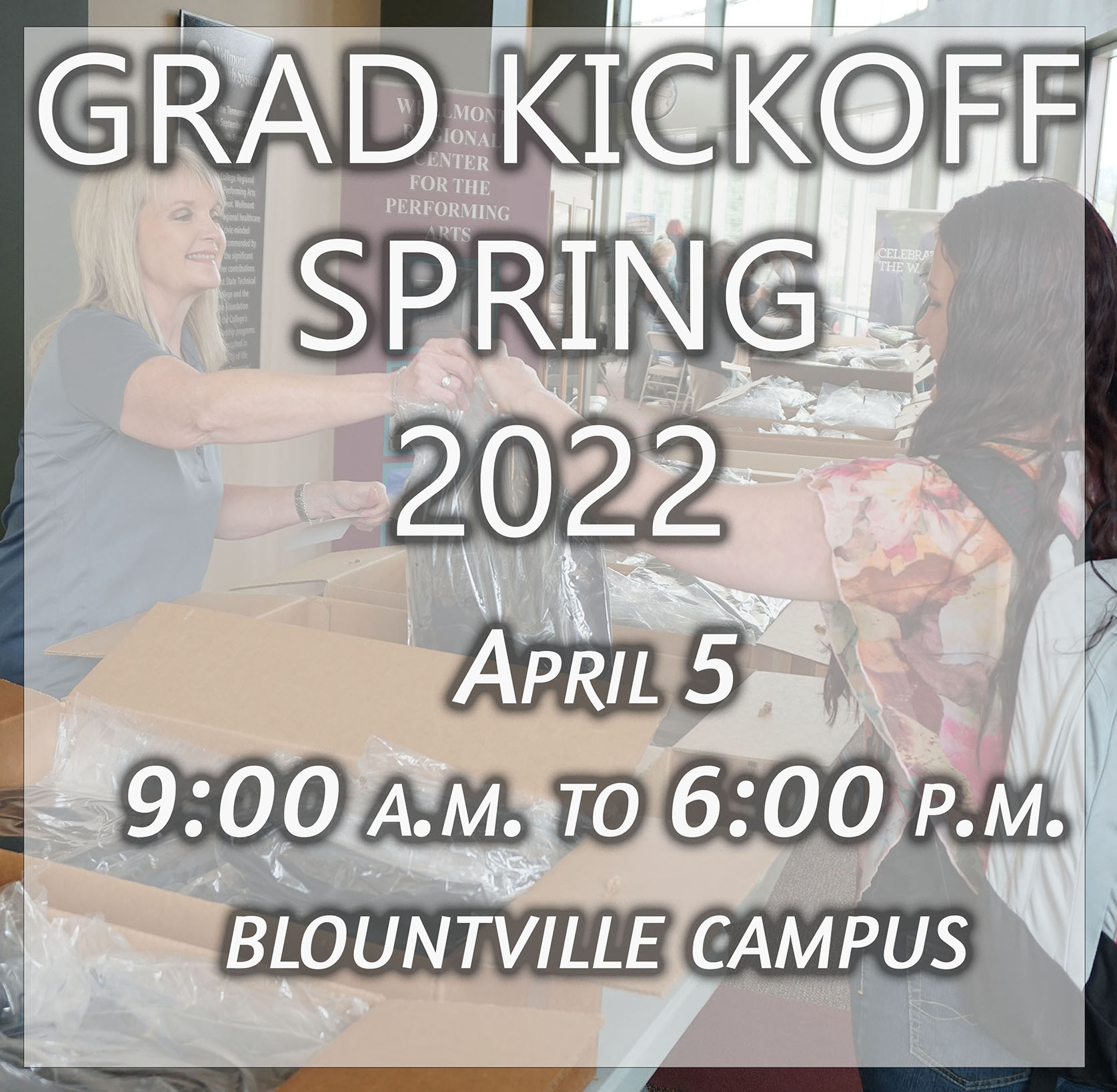 Pick up your cap and gown at the Spring Graduation Kickoff event on April 5 from 9:00 a.m. to 6:00 p.m., on the Blountville campus next to Tri-Cities Airport. Students being recognized as graduates at the Spring 2022 commencement event are invited to pick up those caps and gowns to wear in the ceremony.