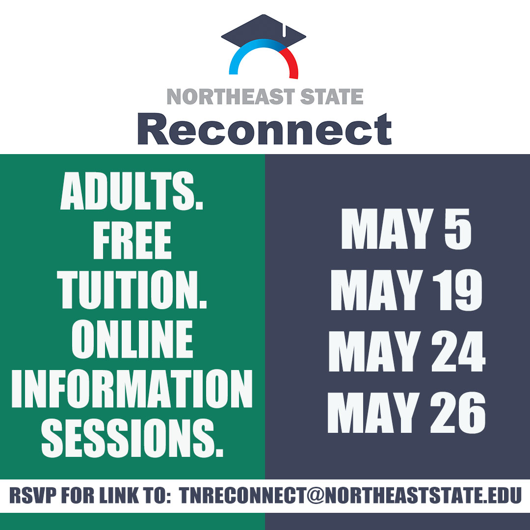 Northeast State announces the May schedule for our FREE-to-attend Tennessee Reconnect information sessions. The online meetings happen via Zoom virtual at the dates listed below. Get an invitation by sending an RSVP to tnreconnect@northeaststate.edu.